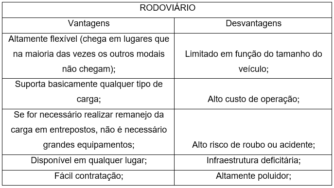 Entre as desvantagens pode-se citar o alto custo operacional deste modal, o que implica em altos custos unitários de transporte. Comparativamente a outros modais, o transporte rodoviário está associado a altos riscos de acidentes, e estão também sujeitos a riscos de roubo. Estes dois fatores encarecem ainda mais os custos devido a necessidade de contratação de seguros.