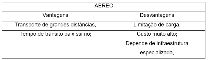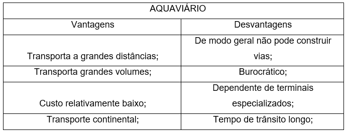 Cada modal tem suas características vantagens e desvantagens. De modo simplificado pode-se dizer que o transporte rodoviário consegue chegar a qualquer ponto geográfico; o transporte ferroviário e aquaviário movimenta grandes quantidades, com bom custo unitário; o transporte aéreo é extremamente rápido; e o transporte dutoviário é bastante específico e econômico para o tipo de produto que consegue transportar.