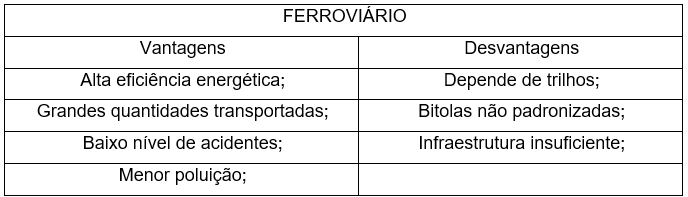 Comparativamente ao método mais utilizado que é o rodoviário, o transporte ferroviário apresenta mais eficiência energética, entrega mais carga transportada por consumo de combustível, tem menor nível de acidentes e menos poluidor.