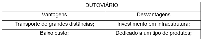 Aqui não vá veículo transportador, diferente dos outros modais, e normalmente a empresa que comercializa o produto é a detentora da via (os dutos).