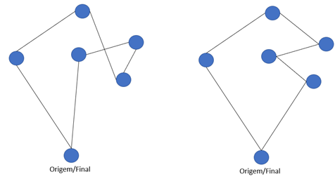 Em uma rota há cruzamentos, o que não é o ideal, na outra não há cruzamentos. Ambas têm o formato de uma “lágrima” a partir da origem.