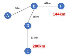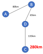 Prosseguindo a análise, verifica-se o caminho mais curto de A para C. O caminho direto tem 330km, verifica-se se há outro caminho mais curto. O caminho A-B-D-C (80km+65km+135km) tem 280km, ou seja, é menor que o caminho direto, assim, exclui-se o caminho direto A-C. A rede tem um total acumulado de 280km até agora, e é representada a seguir.