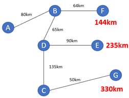 Os caminhos completos e disponíveis até aqui são A-B-F com 144km, A-B-D-E com 235km, e A-B-D-C-G com 330km. Por enquanto a rede está assim.