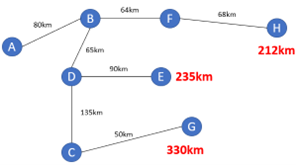Partindo de F, liga-se a H com 68km. Como o caminho de F para E já foi excluído, outros caminhos também não levarão a uma distância menor. O total desta rota A-B-F-H está em 212km.