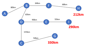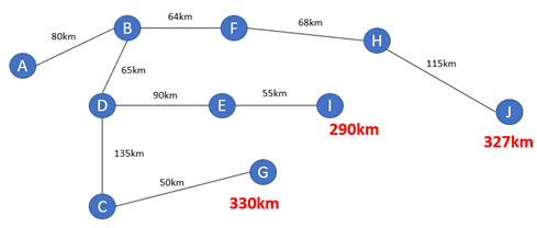 Agora sobram H e I para ligar a J que é o destino. Partindo de H que já tem um acumulado de 212km, e somando 115km, chega-se a J com um acumulado de 327km. Partindo de I, que tem um acumulado de 290km, somando-se 140km, tem-se um acumulado de 430km.