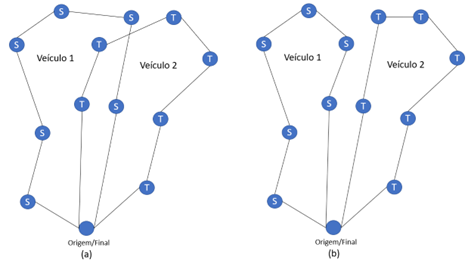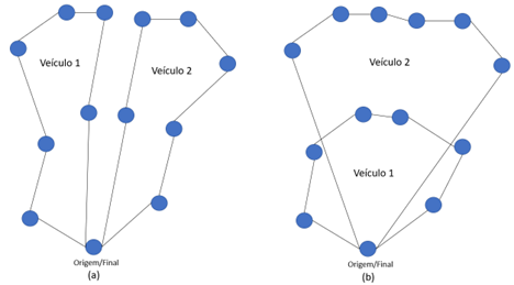 Em (a) os veículos percorrem grandes distâncias de uma entrega a outra, em (b) os veículos percorrem menores distâncias entre as entregas.