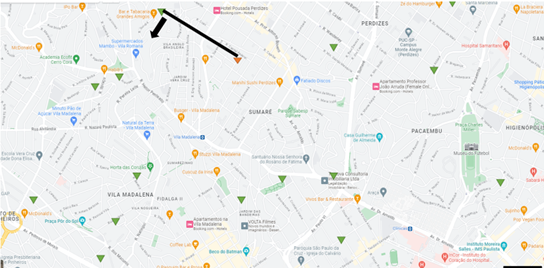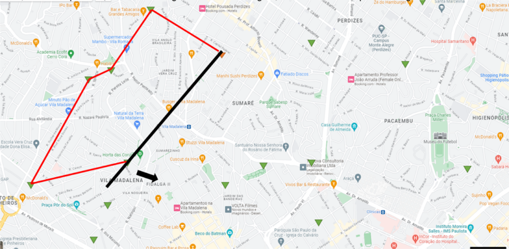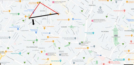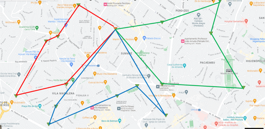 Para exemplo, considere que serão realizadas entregas na região do Sumaré na cidade de São Paulo. Os triângulos no mapa representam todos os destinos que precisam ser atendidos. Se utilizará um veículo com uma capacidade de 250kg, e que cada destino no mapa demanda 50kg, ou seja, cada viagem conseguirá atender cinco destinos.