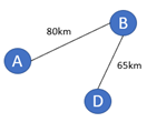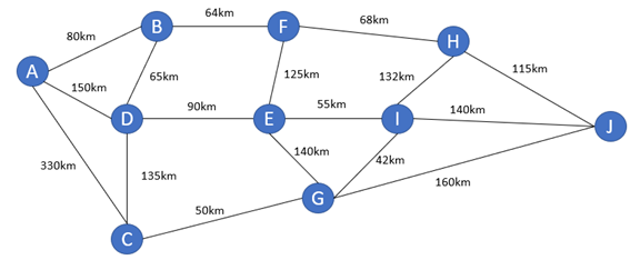 Inicialmente testa-se o caminho para chegar de A até B. O caminho direto entre os dois tem 80km. Testando outros caminhos para chegar em B, nenhum apresenta uma distância menor, por exemplo, seguindo de A para D, e depois para B, soma-se 150km + 65km resultando em 215km.