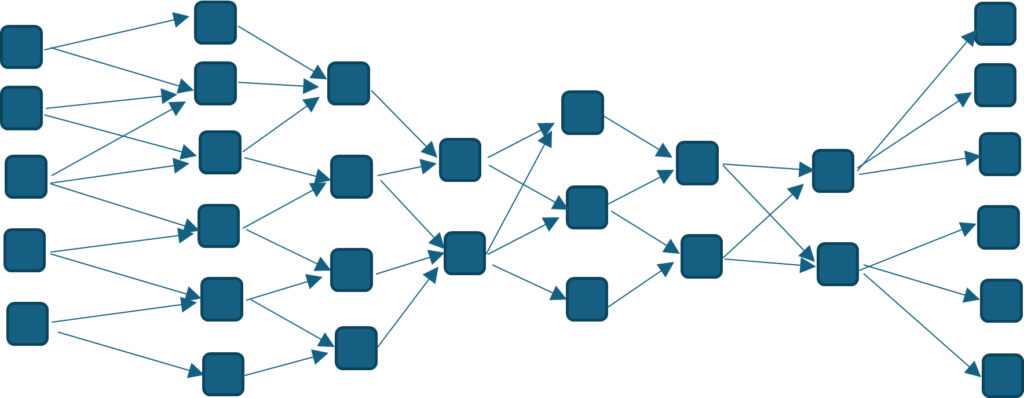Nesta rede de suprimentos fictícias temos várias empresas que fornecem materiais desde o início da cadeia até o consumidor final. As cadeias de suprimentos são extremamente complexas e comumente as empresas dentro de um segmento também fazem parte de outras cadeias de segmentos diferentes. Essas cadeias também podem tomar diversas formas e extensões.