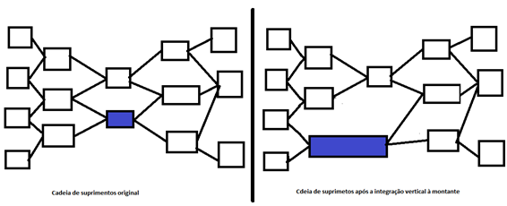 Integração Vertical à Montante (para trás): ocorre quando uma empresa começa a produzir ou realizar uma atividade que era realizada por seu fornecedor.
