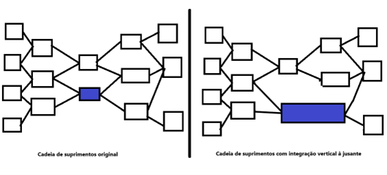 Integração Vertical à Jusante (para frente): ocorre quando uma empresa começa a produzir ou realizar uma atividade que era realizada por um cliente.