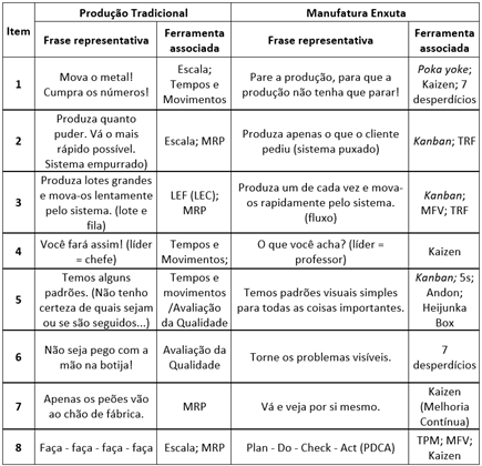 Analisando o quadro, pode-se observar que há grandes diferenças de abordagens na administração da produção sob o novo enfoque introduzido pela Manufatura Enxuta, e o comportamento aplicado tradicionalmente na indústria com a Produção Tradicional.