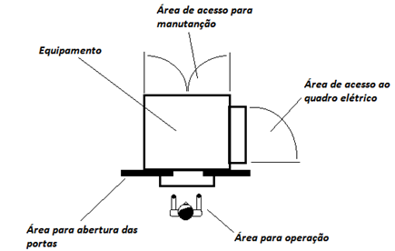 Ao se considerar a localização física do equipamento é importante considerar as áreas com acessos para realizar manutenções e sua área de operação. A figura a seguir ilustra uma situação típica.
