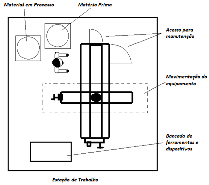 A área para operação dos equipamentos representa o espaço mínimo necessário para os operadores executarem suas tarefas. Esta área deve considerar o espaço para armazenamento e movimentação de matérias, área para armazenamento de dispositivos e ferramentas da operação, assim também como é preciso sempre considerar a área de movimentação horizontal e vertical do equipamento (quando aplicável), conforme ilustrado na figura a seguir.