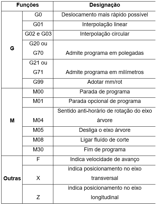 Normalmente esta linguagem trabalha por meio da orientação num plano bidimensional ou tridimensional de eixos ortogonais. O quadro a seguir apresenta um exemplo de linguagem utilizada na programação CNC em equipamentos de usinagem.