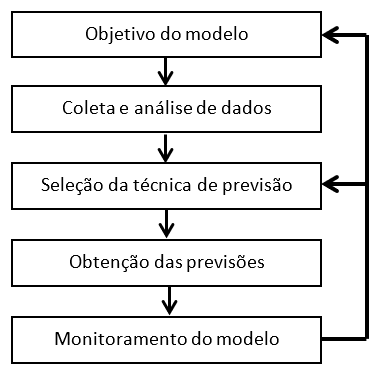 Ao se iniciar a atividade é preciso determinar um objetivo, coletar dados, selecionar um método, para enfim realizar as previsões. Depois das previsões realizadas é preciso monitorar o modelo de modo a observar os erros para avaliar a sua acurácia.