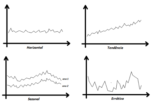 Com relação especificamente ao histórico da demanda, sua compilação e sequenciamento período a período dá origem ao que se chama de série temporal. A série temporal de dados da demanda representada visualmente em gráficos de linhas revela o comportamento básico da demanda. Estes comportamentos podem ser caracterizados em quatro formas principais: