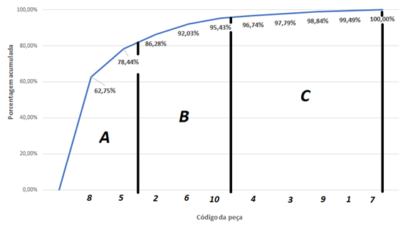 No exemplo os dois primeiros itens (peças 8 e 5) representam em conjunto 78,44% do volume financeiro movimentado ao longo do ano. Apenas estes dois itens representam a maior parte da movimentação financeira, e são apenas 20% dos diferentes itens em estoque. São então classificados como itens A.