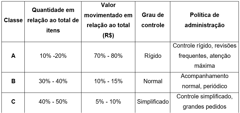 Esta é uma classificação arbitrária, e dependerá da ponderação de quem a está realizando, mas de modo geral, 20% do total de itens será classificado com itens A, 30% de itens classificados como B e 50% dos itens classificados como C.
