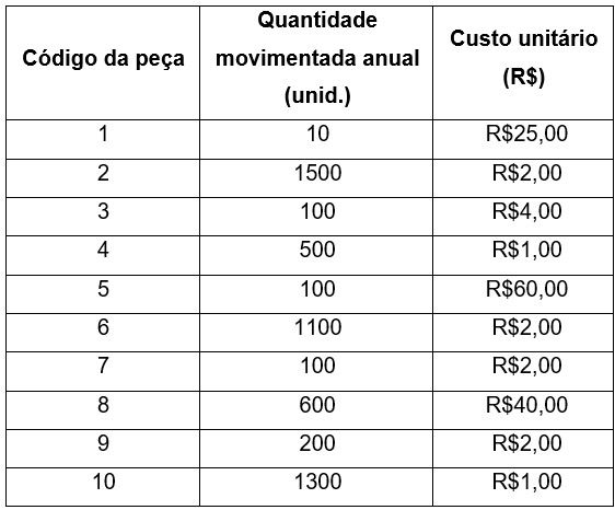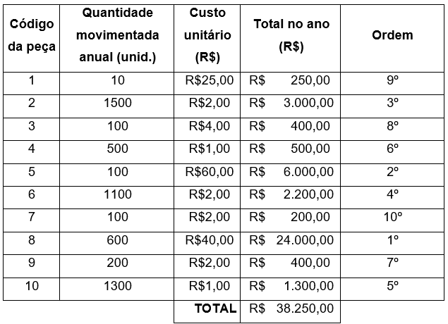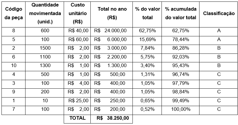 Na tabela o total movimentado no ano é multiplicado pelo custo unitário, assim por exemplo, a peça código 5 teve uma movimentação ao longo do ano de 100 unidades, com um custo unitário de R$60,00, foram movimentados R$6.000,00 ao longo do ano.