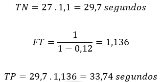 Voltando ao exemplo anterior, determinou-se a necessidade de 7 cronometragens da operação de embalagem. Os tempos obtidos foram respectivamente de 26, 25, 27, 28, 27, 29 e 27 segundos, o que leva a um Tempo Médio Cronometrado (TM) de 27 segundos.