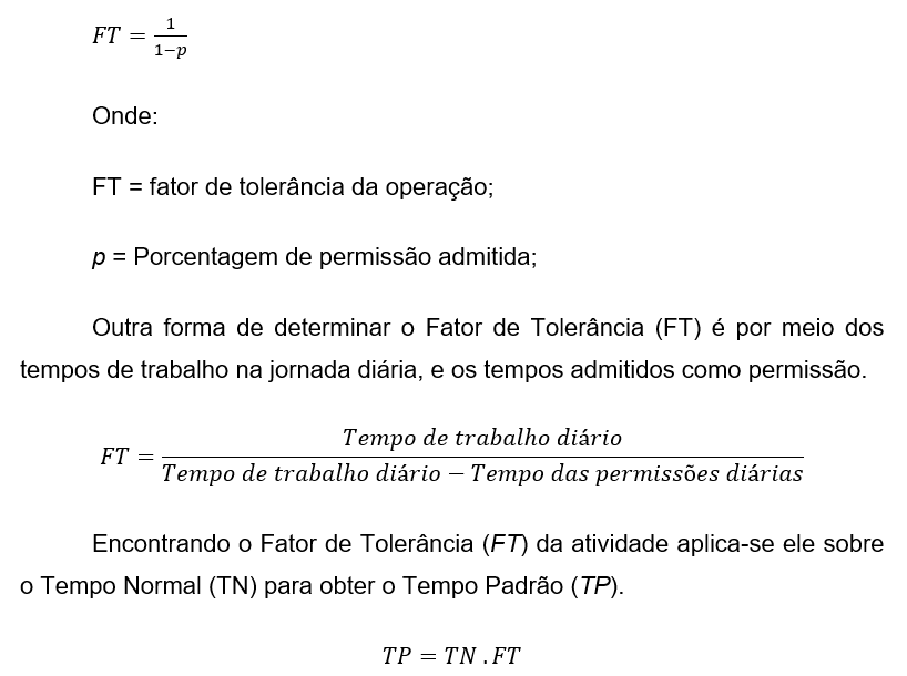 Ou seja, daqui por diante ao se mencionar um Tempo de Ciclo (Tc) neste material não está se referindo somente ao tempo que efetivamente é executado na produção, mas sim a este tempo já com tratamento considerando a o ritmo de trabalho (r) e as permissões (p) em relação a fadiga e necessidades pessoais.