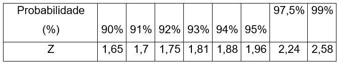 Z = parâmetro da distribuição normal padronizada dado em função do nível de confiança determinado;