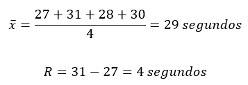 Para obter um tempo representativo é necessário realizar um estudo de tempos inicialmente definindo o tamanho da amostra necessária. Assim, são tomados quatro tempos como uma amostra preliminar, onde se registram 27 segundos, 31 segundos, 28 segundos e 30 segundos. Encontra-se a média ( ) e amplitude (R) da amostra preliminar conforme apresentado a seguir.