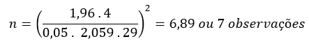 Para uma amostra inicial de quatro observações recorrendo a Tabela 7.1, encontra-se um valor de d2 igual a 2,059. O estudo adotará um nível de confiança de 95%, o que consultando a Tabela 7.2 corresponde a um valor de Z de 1,96. Também se adotará um erro relativo (e) de 5%. Assim: