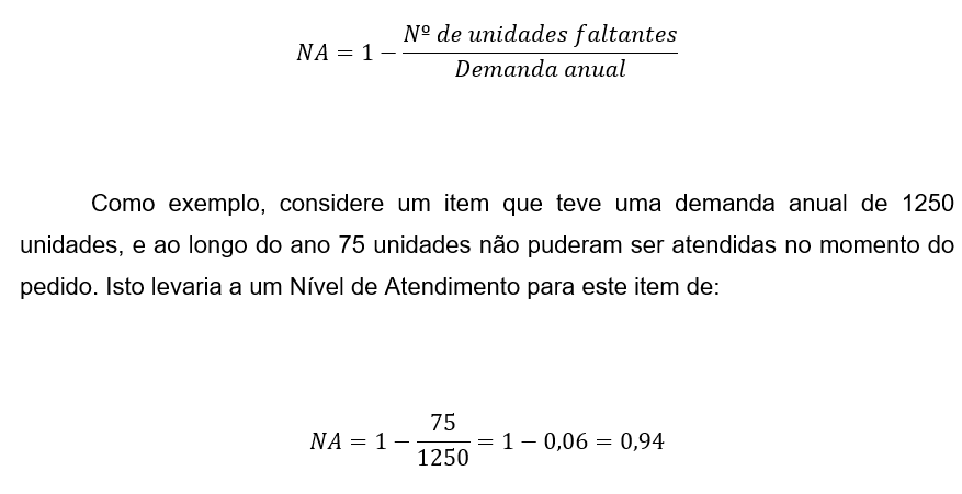 Talvez o principal componente que compõe o Nível de Serviço é o Nível de Atendimento (NA) do estoque para cada item ao longo do tempo. O Nível de Atendimento representa a capacidade do estoque atender a demanda sem que ocorram faltas de materiais.