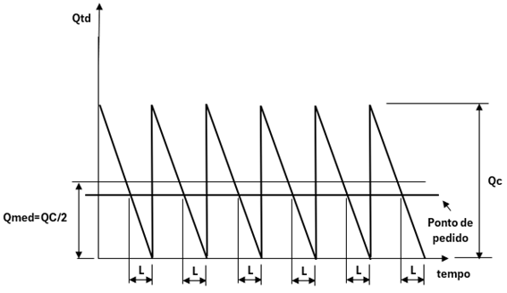 No início o estoque apresenta uma quantidade qualquer (Qc) que vai sendo consumida constantemente ao longo do tempo. Em algum ponto é realizado um novo pedido que levará o tempo “L” para chegar. Passado o tempo “L”, o estoque estará no seu nível mínimo, e o pedido realizado chegará para abastecer o estoque, elevando-o novamente para a quantidade Qc.