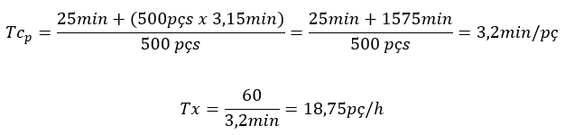 Seguindo o exemplo anterior, a operação produz diferentes itens, então a cada novo lote é necessário preparar o equipamento, o que é realizado em 25 minutos. Para o item em questão são produzidos lotes de 500 unidades, assim o Tcp e a Taxa de Produção (Tx) seriam respectivamente: