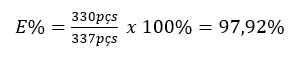 Considerando o exemplo, ao final do dia existiam 330 peças finalizadas na operação, sua Eficiência (E%) seria: